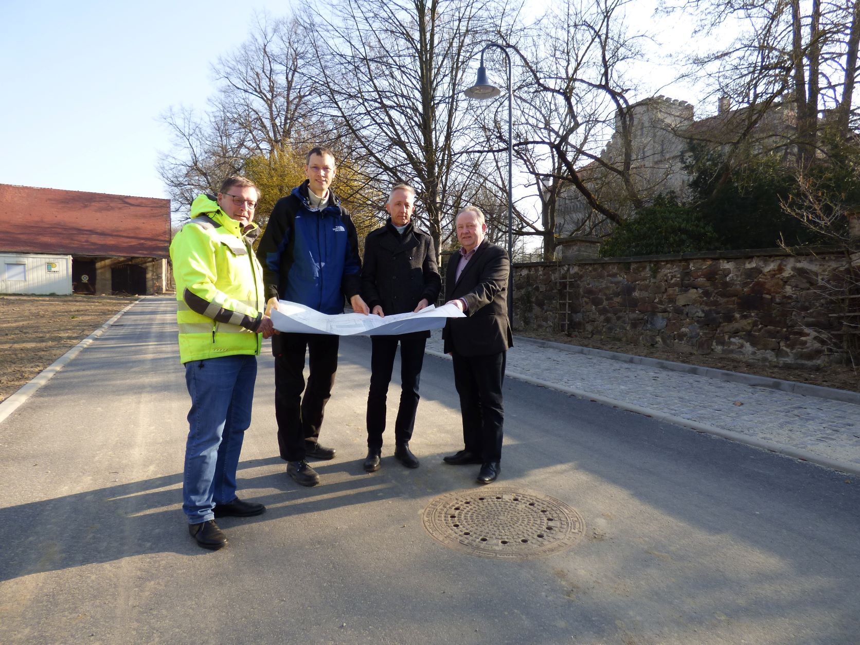v.l.: Herr Linke (COMMUNALCONCEPT Ingenieurbüro Peter Linke), Herr Mannhaupt (Mitarbeiter Gemeinde Wachau), Herr Nieder (Erschließungsträger Rittergut Seifersdorf GmbH & Co. KG), Herr Künzelmann (Bürgermeister Gemeinde Wachau)