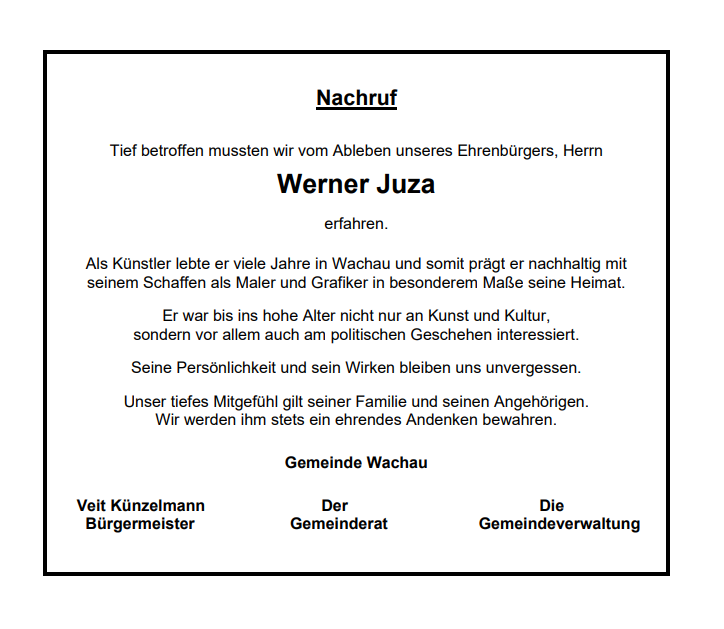 Werner Juza - Ehrenbürger von Wachau - im Alter von 98 Jahren verstorben