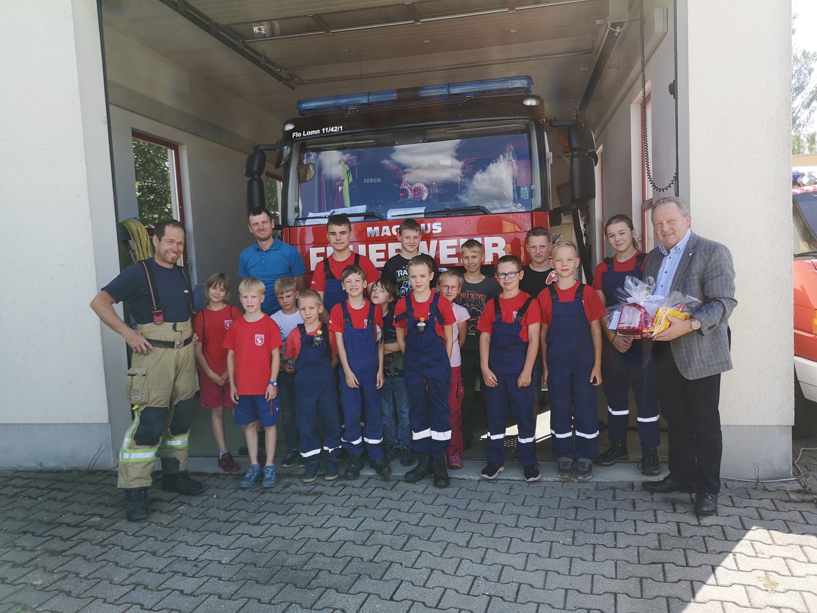 Foto: Bürgermeister Veit Künzelmann gratuliert der Jugendfeuerwehr Lomnitz am 12.07.2022