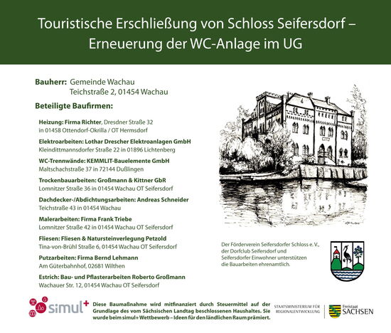 Aktuell laufen die ehrenamtlichen Vorarbeiten der Seifersdorfer Vereine für die Erneuerung der WC-Anlage im UG des Schlosses. Die Vereine unterstützen mit der Eigenleistung die Gemeinde Wachau, die im Mai 2020 mit der Idee für ein „multimediales Museum und Einrichtung eines Besucherzentrums im Seifersdorfer Schloss“ beim SIMUL+-Wettbewerb – Ideen für den ländlichen Raum des Staatsministeriums für Regionalentwicklung des Freistaates Sachsen ein Preisgeld in Höhe von 200.000 Euro prämiert wurde. Die Baumaßnahme wird mitfinanziert durch Steuermittel auf der Grundlage des vom Sächsischen Landtag beschlossenen Haushaltes.